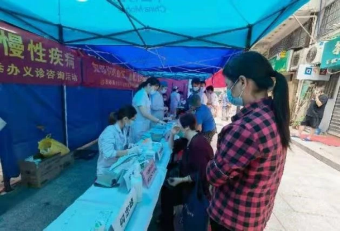 医疗组唐咸玉主任、孙璐医生、谢雯雯医生为社区居民们细心诊脉、开药及普及预防保健知识,面对每一位前来咨询问诊的居民,医生们都耐心地倾听居民情况,用通俗易懂的语言解答健康问题。现场还开展了免费检测血压、血糖及快速尿蛋白等项目,以便及时筛查居民们的慢性病,做到早预防、早控制。